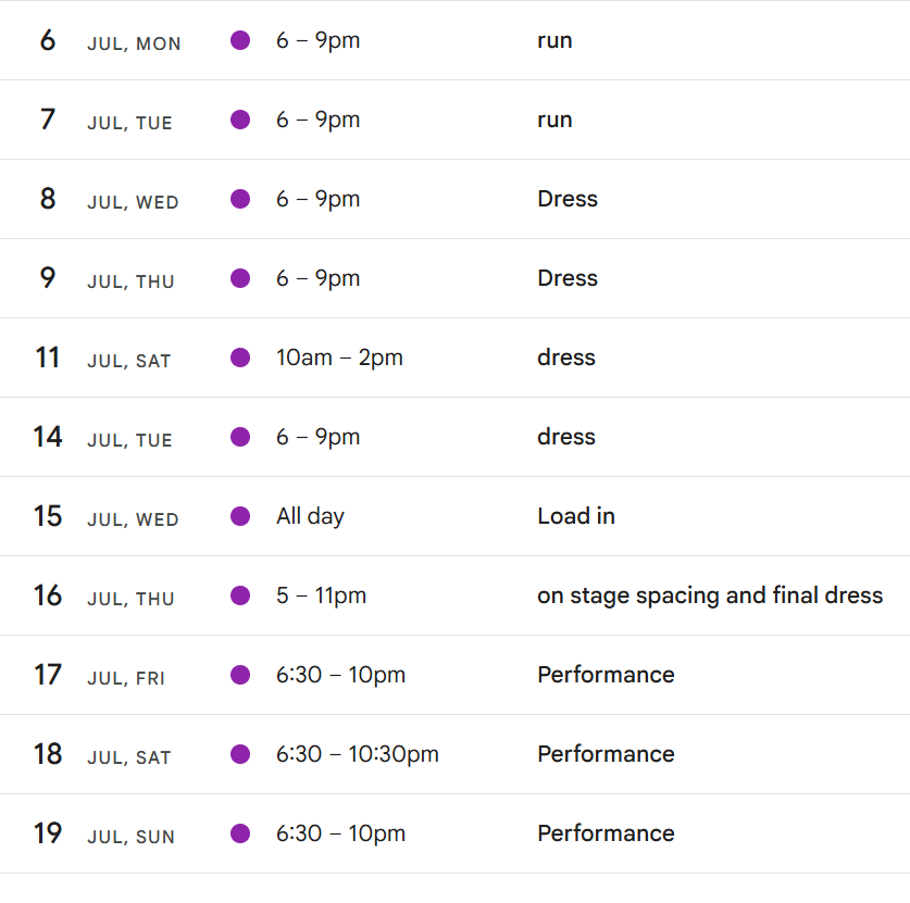 Weekly Rehearsals: Mondays-Thursdays, 6-9pm and Saturdays, 10am-2pm